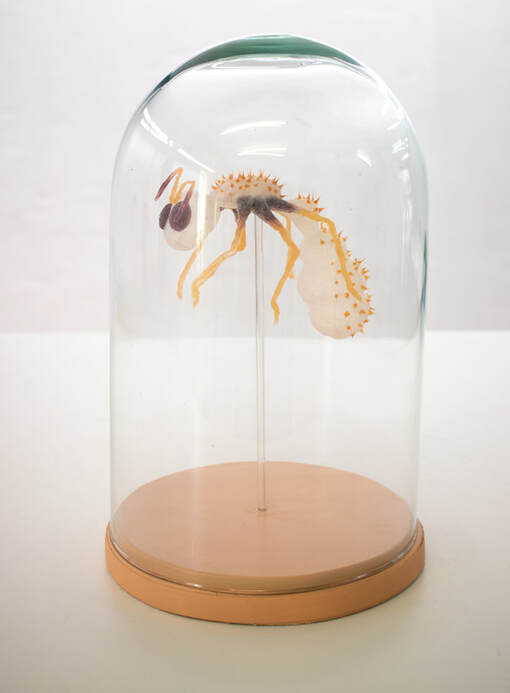 Het thema, insecten en ander klein gedierte, is ontstaan door zijn voorliefde voor rariteitenkabinetten. Evenals opgezette dieren en op sterk water gezette organen in natuurhistorische musea. De stolpen waarin zijn werken geplaatst zijn refereren daar aan.